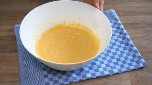 Do misky vyklepněte tři vajíčka a elektrickým šlehačem je několik minut šlehejte, dokud nezačnou nabývat na objemu a vytvoří napěněnou konzistenci. V průběhu šlehání přidejte k vajíčkům také cukr a pokračujte v míchání, dokud se všechen nerozpustí. Přes jemné sítko k našlehaným vajíčkům prosejte hladkou mouku spolu s práškem do pečiva a špetkou soli a pokračujte ve šlehání, dokud ji úplně nezapracujete do těsta. Přilijte 100 gramů rozpuštěného másla a znovu prošlehejte.