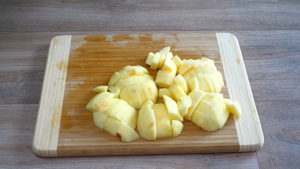 Připravte si tři jablka, oloupejte z nich slupku, rozkrojte je na poloviny a ty rozkrájejte na tři velké díly tak, abyste vykrojili jadřinec uprostřed. Třetiny pak rozkrájejte na větší kostky. Dno kulaté dortové formy vyložte pečicím papírem a vsypte do ní pokrájená jablka, která zasypejte cukrem a dobře promíchejte.