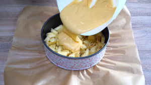 Posypejte jablka podle chuti mletou skořicí a zalijte je připraveným těstem, které stěrkou rozetřete rovnoměrně po celé ploše jablkové vrstvy. Poté formou několikrát zatřeste a klepněte o pracovní desku, aby se těsto usadilo i do prostoru mezi jablky a nevznikly tak v koláči mezery.