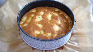 Formu s těstem pak vložte do trouby vyhřáté na 180 °C a pečte ho asi 35 minut, dokud jeho povrch nezezlátne. Zapíchnutou špejlí vyzkoušejte, jestli je koláč dobře propečený skrz naskrz. Jestliže ano, příborovým nožem opatrně oddělte obvod koláče od bočnic formy a koláč opatrně vyklopte vzhůru nohama na talíř. Takto ho přeneste zpátky na plochou část dortové formy a vložte ho na 3 minuty zpátky do trouby, aby zezlátla i vrchní strana. Pak už jen koláč nakrájejte na trojúhelníkové dílky a podávejte se šálkem voňavého čaje nebo kávy.