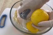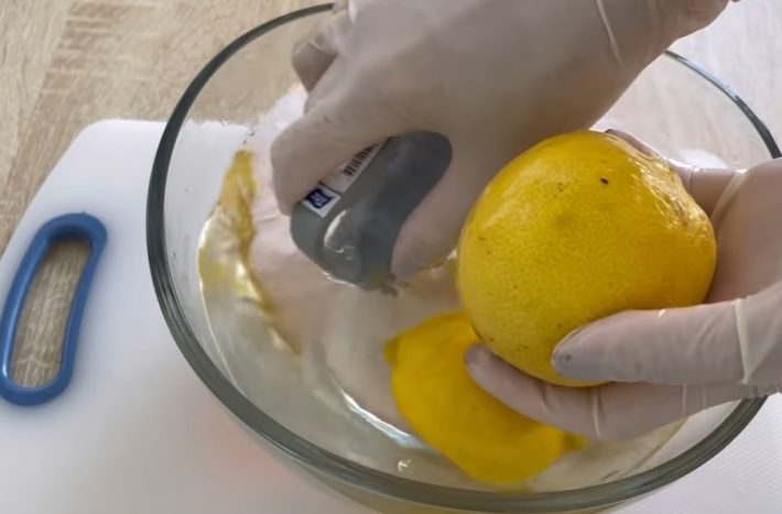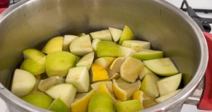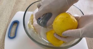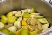 Citrony dejte do mísy a zalijte je vroucí vodou. Nechejte odležet 10 až 15 minut. Mezitím omyjte jablka, zbavte je jadřinců a nakrájejte je na větší kostičky kostičky. Umístěte jablka do hrnce a vraťte se k citronům. Nasypejte na ně lžičku soli a začněte jejich slupku drhnout kartáčem, čímž z nich přírodní cestou odstraníte všechny nečistoty z obchodu.