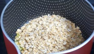 Na sporáku rozehřejte hluboký hrnec, do kterého dejte lžíci olivového oleje. Česnek i zázvor nasekejte nadrobno a přidejte obojí prosmažit do hrnce. Poté ke směsi přidejte ovesné vločky a vše důkladně promíchejte. Restujte zhruba 2 minuty. Jakmile suroviny získají zlatavý nádech, přidejte k nim zeleninu.