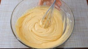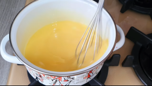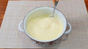 Nyní připravte krém. Do malého hrnce vlijte mléko, přidejte k němu cukr a škrob a na mírném ohni na sporáku přiveďte k varu. V tu chvíli pak přidejte máslo a dobře promíchejte. Hotový krém odstavte z kamen a nechte mírně zchladnout.