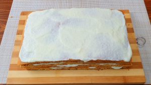 Hotové korpusy nechte zchladnout a překrojte je oba na polovinu. Tím získáte čtyři tenké pláty těsta. Ořízněte ještě okraje plátů po obvodu tak, aby byly dokonale rovné. Odkrojené těsto nechte stranou na posypání hotového dortu.