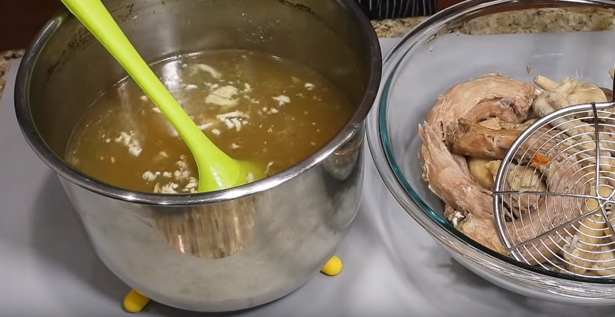 Hotový vývar odstavte z kamen a nechte ho asi 15 minut vychladnout. Poté, pokud chcete, můžete odstranit nadbytečný tuk z povrchu (lze jej vychladit, uložit do ledničky a použít ke smažení nebo při vaření různých pokrmů, třeba bramborové kaše).