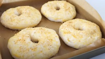 Bagely vařte 25 vteřin z každé strany. Poté je vyskládejte na plech, pokrytý pečicím papírem a pomažte je směsí žloutku a mléka. Pokrm posypte sezamovými semínky a pečte ho v předehřáté troubě na 210 °C po dobu 20 minut.