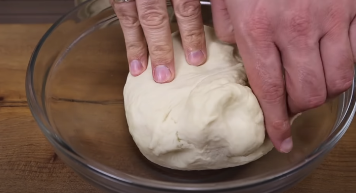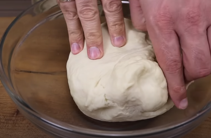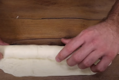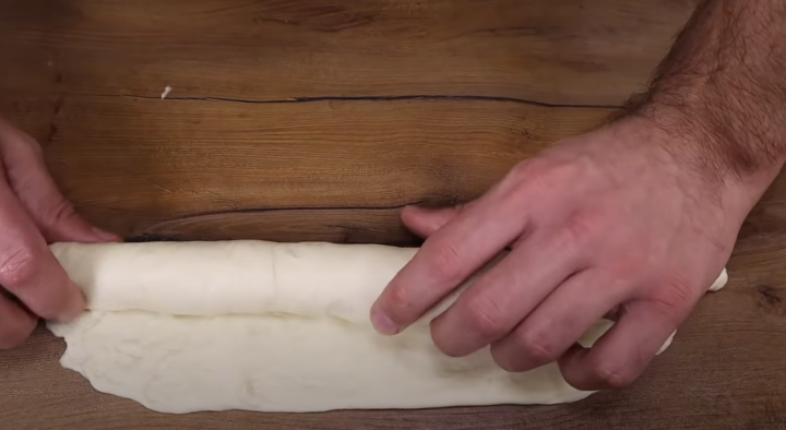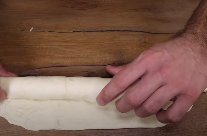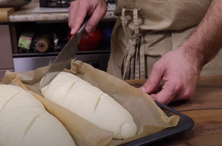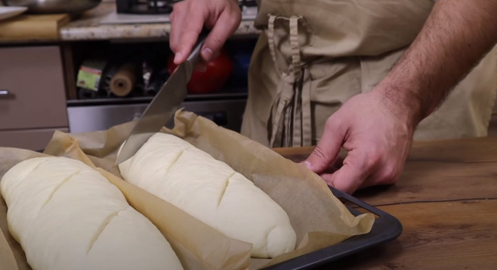 Po vykynutí si těsto vyjměte z mísy na pomoučený vál a rozdělte ho na tři stejně velké kousky. Každý z nich pak vyválejte na tenčí placku, kterou srolujte do tvaru bagety. Okraje nezapomeňte přehnout prsty.