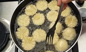 Když se krekry nafouknou a zezlátnou, vylovte je děrovanou lžící z oleje a vložte je do misky vystlané několika vrstvami papírových utěrek, aby z nich okapal přebytečný olej. V misce můžete „brambůrky“ jemně proklepat, případně ještě posypat solí a ihned je podávejte spolu se svou oblíbenou studenou omáčkou.