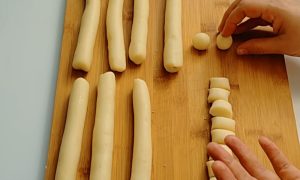 K propasírovaným bramborám přidejte lžičku soli a kukuřičný škrob a zadělejte husté a nelepivé těsto. Na pracovní ploše jej ještě trochu prohněťte a zformujte z něho váleček. Ten rozdělte na 8 stejně velkých dílů a z každého z nich vyválejte rovněž malý váleček. Každý váleček rozkrájejte na 12 malých kousků a z každého vytvořte kuličku.