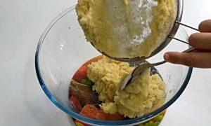 Dvě brambory uvařte ve slupce v osolené vodě doměkka. Po dovaření je slijte, nechte vychladnout, oloupejte slupku a v misce je rozšťouchejte na kaši, kterou následně propasírujte přes sítko, abyste docílili co nejjemnější konzistence. V žádném případě ji ale nemixujte, abyste namísto kaše nezískali lepidlo.