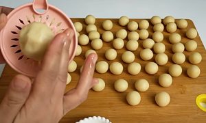 Nyní budete potřebovat nástavec z odšťavňovače na citrón a trochu stolního oleje. Růžici odšťavňovače potřete olejem, vezměte kuličku a co nejlépe ji přitlačte na růžici, čímž získáte mističku s vnitřním žebrováním. Tímto způsobem zpracujte i ostatní kuličky z bramborového těsta.