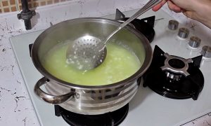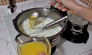 Mléko nalijte do hrnce a na sporáku jej přiveďte k varu. Pokud používáte čerstvě nadojené mléko, nechte ho pár minut provařit. U pasterizovaného to již není nutné. Po dosažení bodu varu přidejte do mléka čtyři polévkové lžíce citrónové šťávy a za občasného míchání pokračujte ve vaření, dokud se tekutina v hrnci nezačne srážet a oddělovat pevnou složku od tekuté.