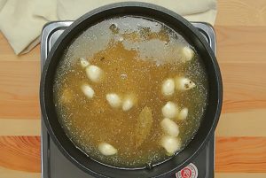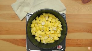 Brambory oloupejte, omyjte a nakrájejte na kostičky požadované velikosti. Na pánvi či v hrnci, ve kterém budete polévku vařit, si rozehřejte máslo a nechejte je na něm osmažit asi dvě minuty. Oloupejte česnek a přidejte jej k bramborám. Dochuťte bobkovým listem, solí, černým pepřem a zalijte vývarem.