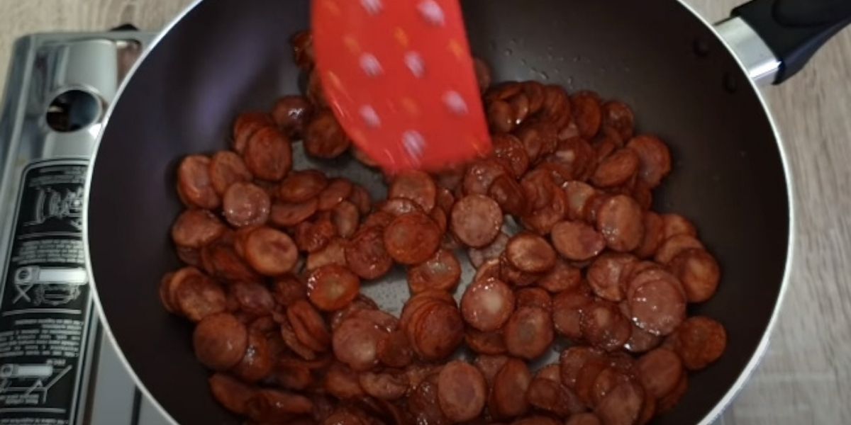Uzenou klobásu nakrájejte na kolečka. Na kamnech rozpalte pánev a klobásu nasucho nebo s malou kapkou oleje orestujte dozlatova. Pak odstavte z kamen a na chvíli odložte stranou.