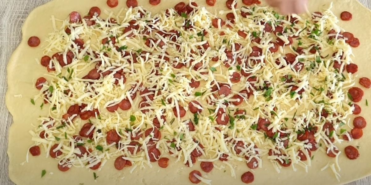 Plát těsta rovnoměrně zasypejte osmaženými kolečky klobásy, zasypejte strouhaným sýrem mozzarella a na závěr posypte čerstvými lístky bazalky pokrájenými či natrhanými na menší kousky.