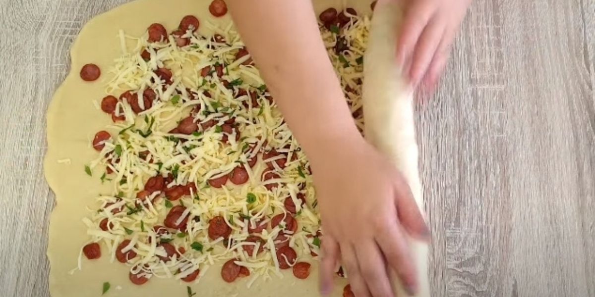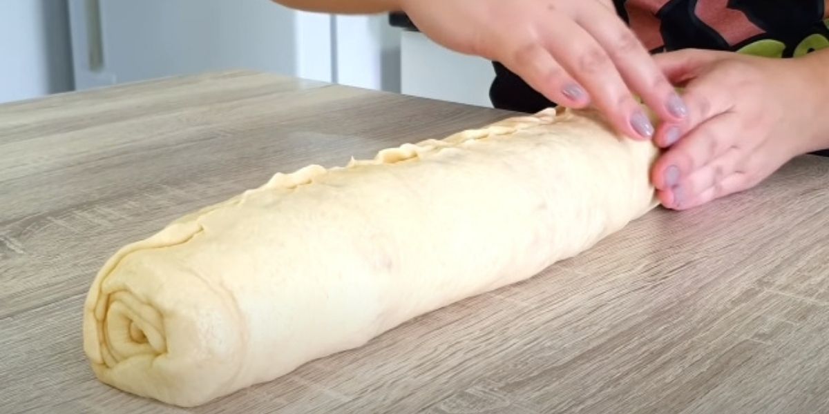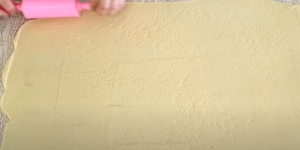 Pak těsto rozválejte na tenkou obdélníkovou placku.