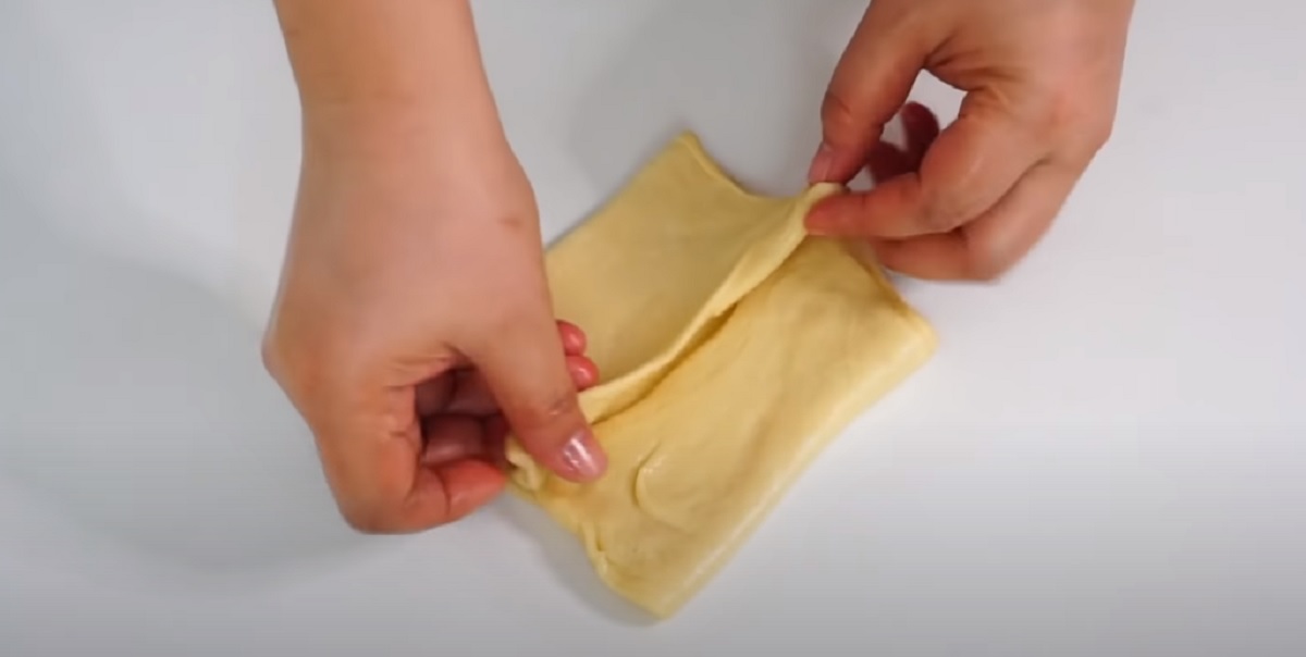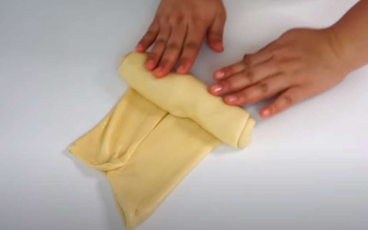 První možností je z každého kusu těsta vyválet obdélníkový plát o síle kolem 3 až 4 milimetrů, který rozkrájíte na tři stejné obdélníčky. Dva protilehlé okraje obdélníku složte ke středu, válečkem trochu rozválejte a stočte do pevné roličky a konec dobře zamačkejte, aby se nerozbalovaly.