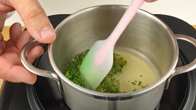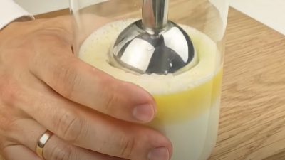 Do jiného rendlíku vlijte mléko, které minutu zahřívejte a vmíchejte do něj máslo, které nechte rozpustit. Po další minutě směs přelijte do mísy, přidejte k ní vychlazenou citronovou tekutinu a vše spojte mixováním.
