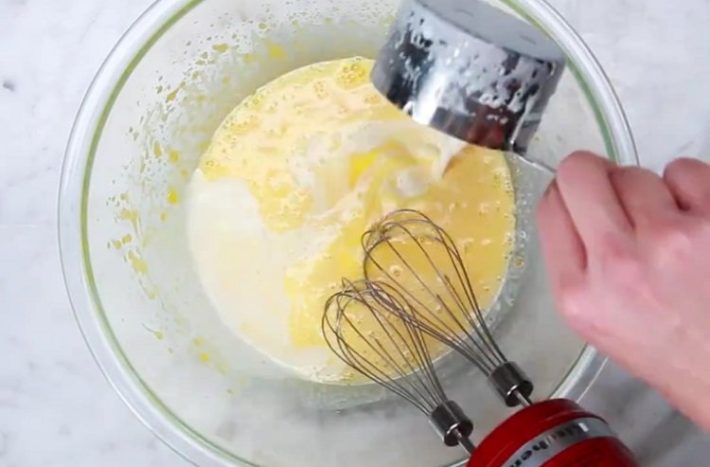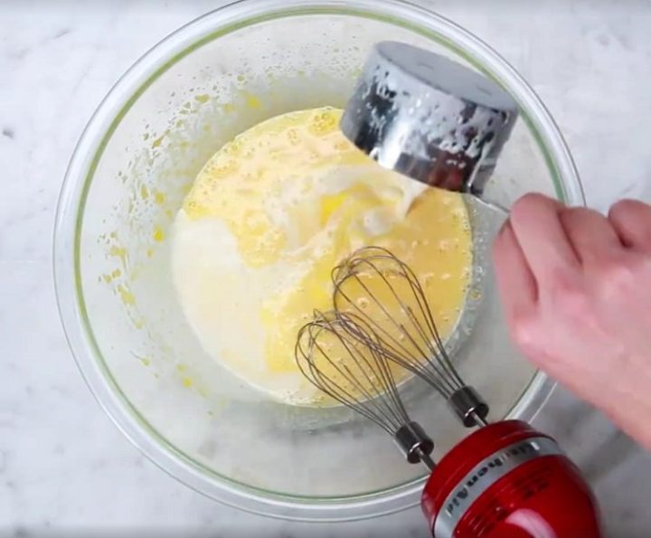 Následně si v samostatné misce vyšlehejte do pěny vaječné žloutky s polovinou krupicového cukru z určeného množství. Směs pak vlijte do zahřáté smetany a metličkou míchejte do zhoustnutí. Udržujte mírný až střední plamen. Až bude hmota hustá, odstavte ji z plotny.