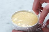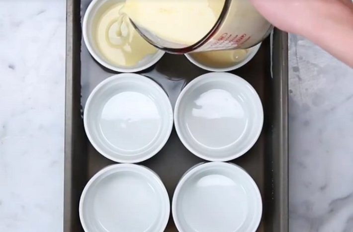 Připravený krém ze smetany a vaječných žloutků postupně vlijte do jednotlivých zapékacích mističek a ty pokládejte do plechu naplněného z části vodou. Poté vše dejte do trouby a nechte „vařit“ asi 45 minut při 165 stupních Celsia.