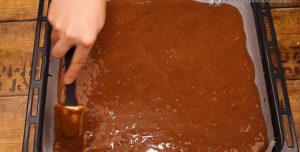 Do hluboké misky prosejte přes jemné sítko mouku s práškem do pečiva a třemi polévkovými lžícemi kakaa a vše promíchejte. Do jiné misky vyklepněte tři vajíčka, přidejte k nim cukr a elektrickým šlehačem je rozšlehejte do jemné, bělavé a napěněné konzistence. Přidejte k ní hrnek vlažné vody, stejné množství rostlinného oleje, promíchejte, a nakonec zapracujte moučnou směs. Vytvořte homogenní polotekuté těsto, které vlijte do plechu vyloženého pečicím papírem.