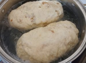 Ve velkém hrnci přiveďte k varu vodu s trochou soli. Když voda divoce bublá, vhoďte do ní knedlíky, které zpočátku jemně odstrkujte ode dna, aby se nepřipálily. Postupně se šišky odlepí samy a vystoupají k hladině. Průběžně je otáčejte, aby byly dobře provařené, a nechte je vařit 15 až 20 minut.