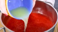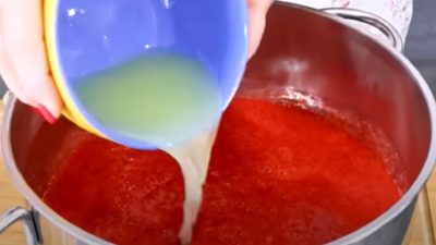 Vzniklou hmotu nalijte do většího hrnce, smíchejte ji s citronovou šťávou, vodou a vařte ji 20 minut na mírném ohni.