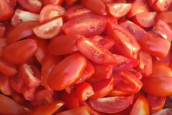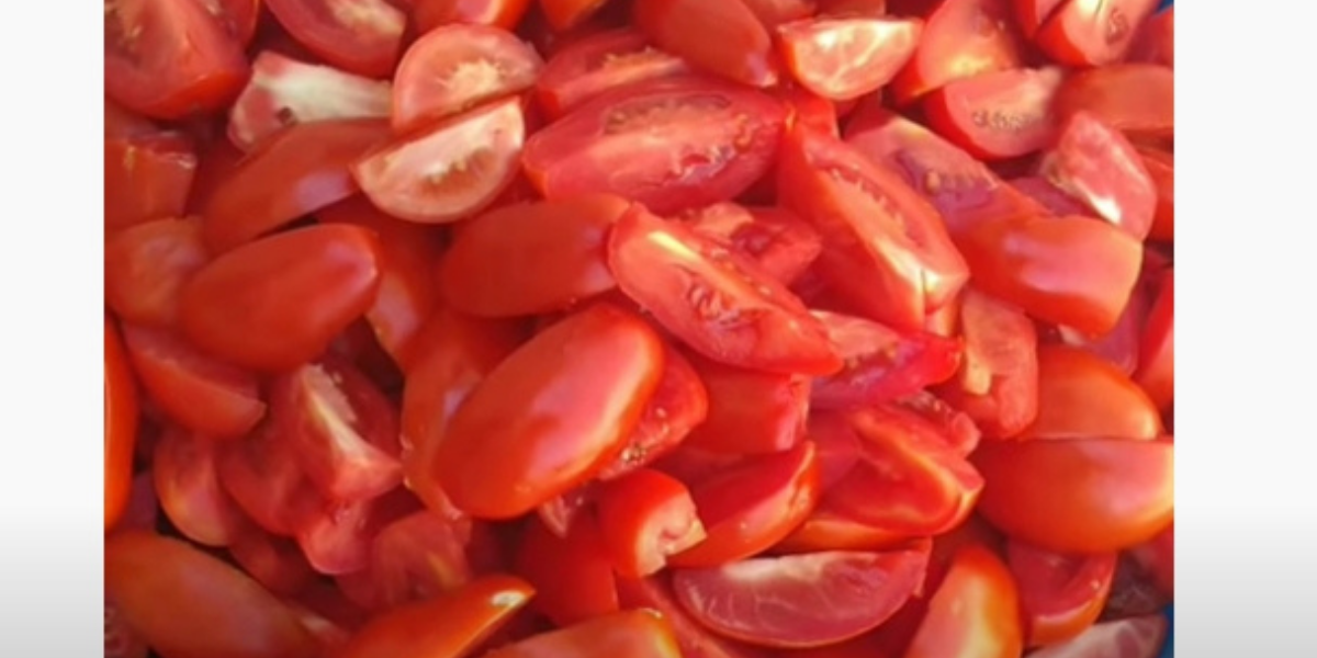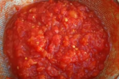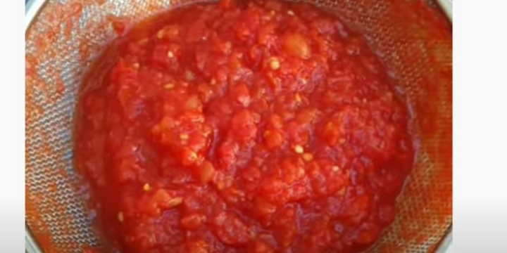 Rajčata umyjte, případně osušte, rozkrojte je na čtvrtiny a semelte je mlýnkem na maso do velkého hrnce.