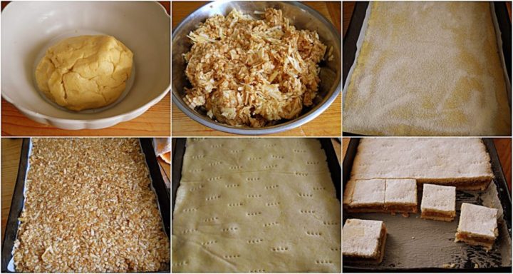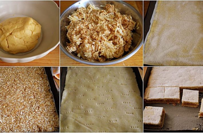 Plech vyložte pečicím papírem a vyložte ho prvním plátem těsta, jehož povrch posypejte jednou lžící krupice. Na těsto rovnoměrně navršte jablkovou náplň, posypejte druhou lžící krupice a položte druhý plát těsta. Celý vrchní plát hustě a rovnoměrně propíchejte vidličkou, aby při pečení mohla z jablek unikat horká pára.