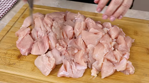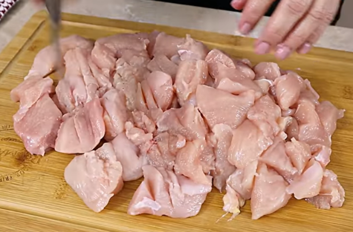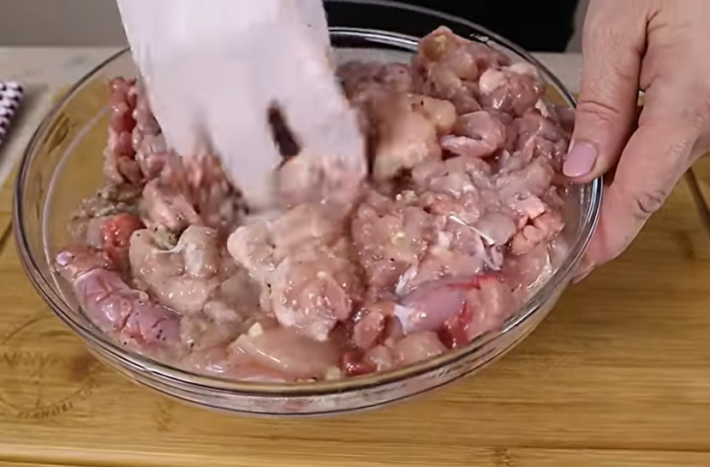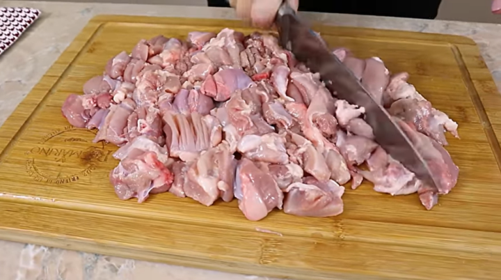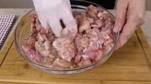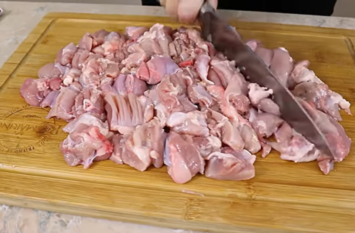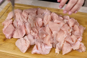 Jak snadno vyrobit domácí kuřecí šunku, která neohrozí zdraví škodlivými aditivy? Připravte si omyté kuřecí prsní řízky, které nakrájejte na velké kusy. Poté je rozkrájejte na menší kostky a následně sekáčkem nebo nožem nasekejte. Maso by se nemělo mlít, měly by zůstat větší kousky. Nahrubo nasekané kuřecí maso vložte do hluboké misky.