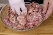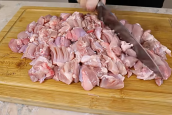 Nyní si připravte kuřecí stehna, oddělte kůži od masa. Nožem vykrájejte kosti, odřezky uschovejte pro uvaření vývaru. Maso opět nakrájejte na menší kousky a opět jako v prvním případě za pomoci ostrého nože nebo sekáčku nasekejte maso. Poté jej přidejte do misky. Odřezky, kůži a kosti vložte do hrnce a zalijte 1 litrem studené vody. Dejte vařit a po dosažení varu nechte probublávat ještě 30 minut.