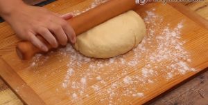 Do hrnku nebo misky nalijte teplé mléko, rozdrobte do něho droždí a přidejte lžičku cukru. Promíchejte a na 10 až 15 minut odložte na teplé místo, aby se kvasinky probudily k životu. Že se vše odehrálo, jak má, poznáte podle bublinek, které se začnou vytvářet na povrchu směsi. Pak můžete pokračovat v práci. Hladkou mouku prosejte přes jemné sítko do hluboké mísy, přidejte sůl a dobře promíchejte. Přilijte smetanu a aktivovaný kvásek, vyklepněte jedno vajíčko a vše začněte promíchávat a zpracovávat na těsto. Když je hmota téměř úplně homogenní, přidejte změklé máslo a pokračujte ve hnětení, abyste získali pružné, vláčné a nelepivé těsto. Aniž byste ho nechávali kynout, vyklopte ho na pracovní plochu posypanou trochou mouky a válečkem jej rozválejte na tenkou obdélníkovou placku.