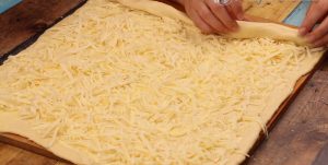 Tu potřete po celé ploše tenkou vrstvou změklého másla, posypejte strouhaným sýrem a stočte těstovou placku do pevné rolády. Zakryjte ji čistou utěrkou a nechte 10 minut odstát. Pak ji rozkrojte na dvě stejně velké části.