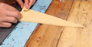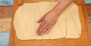 Každou část těsta rozválejte na obdélníkovou placku o rozměrech 30 x 40 centimetrů a ostrým nožem či kráječem na pizzu ji rozkrájejte na trojúhelníky.