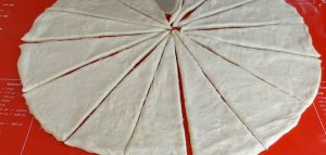 Pracovní plochu posypejte trochou hladké mouky, vezměte jednu těstovou kuličku a rozválejte ji válečkem na tenkou placku. V mikrovlnné troubě nebo na kamnech rozehřejte trochu másla a pomažte jím celý povrch rozváleného plátu těsta. Kráječem na pizzu pak těsto rozkrájejte na 16 stejně velkých trojúhelníků.