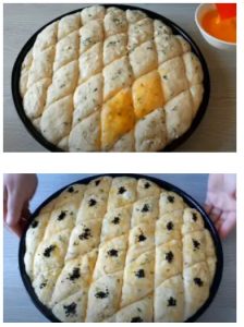 Mísu s těstem nyní přikryjte čistou bavlněnou utěrkou, anebo zakryjte přilnavou potravinářskou fólií a nechte na teplém místě vykynout. Bude to trvat kolem 40 až 60 minut. Těsto by mělo zhruba zdvojnásobit svůj objem. Jakmile těsto vykyne, připravte si čtvercový či kulatý plech, který vyložte pečicím papírem. Těsto do něj vyklopte a s pomocí mokrých rukou roztáhněte těsto tak, aby vyplnilo celou plochu plechu. S pomocí nože či jiného vhodného nástroje vytvořte na povrchu těsta šikmé zářezy do tvaru mřížky, opět zakryjte utěrkou a nechte dalších 30 minut kynout.