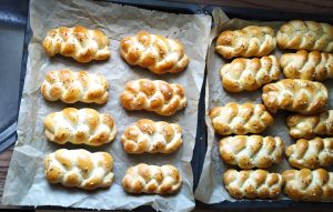 Z těsta udělejte na mírně pomoučněném vále hady a upleťte z nich housky. Mělo by jich být přibližně 10. Rozšlehejte vejce a housky jím potřete. Poté je posypejte podle vaší chuti. Jde využít hrubá sůl, kmín, mák nebo další obvyklé sypání.