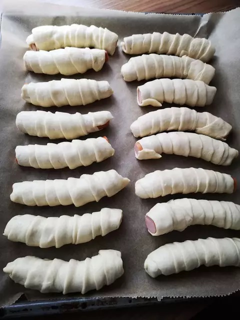 Pás trochu roztáhněte a tím se těsto přilepí na párky. Vrstvy by se měly mírně překrývat. Poté je nechte 30 minut odpočívat.