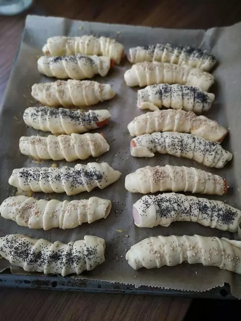 Pečte na 200 stupňů po dobu 20-25 minut. Podávat je můžete teplé i studené s hořčicí a kečupem podle chuti.