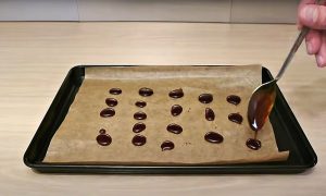 Připravte si plech nebo tác vyložený pečicím papírem. Z karamelové směsi s pomocí lžičky vytvářejte na plechu kulaté bonbóny, anebo naplňte zdobicí sáček a vymačkávejte z něj na plech malé puntíky.