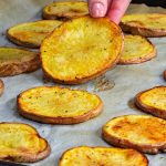 Nyní si k ruce vezměte plech s pečícím papírem a vyskládejte na něj jednotlivé plátky okořeněných brambor (neměly by se překrývat). Pak vložte do předehřáté trouby a pečte asi dvacet minut při teplotě 220 °C.
