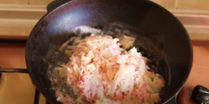 Jablka oloupejte, rozkrojte na čtvrtinky a zbavte je jadřinců a stopek. Očištěnou dužninu pak ihned nastrouhejte na hrubém struhadle (při práci s jablky se neloudejte, při kontaktu se vzduchem velmi brzy začnou hnědnout). Na kamnech rozehřejte pánev s kouskem másla. Když se máslo rozpustí a začne bublat, dejte do pánve nastrouhaná jablka a za stálého míchání je minutu smažte. Pak přidejte cukr a vanilkový cukr. Na středním ohni jablka vařte za stálého míchání 5 až 7 minut. Jakmile jablka změknou a odpaří se veškerá přebytečná voda, odstavte pánev z kamen a přeneste jablkový rozvar do misky, kde ho nechte úplně vychladnout.