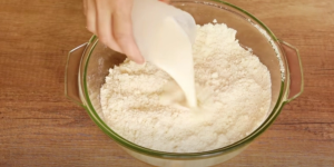 Do hrnku vložte vaječný žloutek, zalijte ho kefírem a obě přísady dobře prošlehejte vidličkou, abyste získali jednolitou směs. V hluboké misce smíchejte mouku, cukr, prášek do pečiva a špetku soli a všechny suché přísady důkladně rozmíchejte. Pak do této směsi přidejte studené máslo nakrájené na menší kostky a rukou nebo vidličkou míchejte a drťte, dokud nezískáte písčitou drobivou směs (pracujte rychle, aby se máslo nezačalo tavit. Pak byste přišli o křehkost těsta). Pak k těstu přilijte směs žloutku a kefíru.