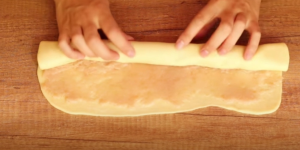 Odpočaté těsto propracujte, rozdělte ho na poloviny a každou z nich rozválejte na tenkou obdélníkovou placku o síle kolem 4 mm. Celou plochu obdélníků potřete bílkem a rozdělte na těsto jablečnou náplň, kterou rozetřete po celé ploše obdélníků. Z delší strany pak stočte těsto do těsné rolády.