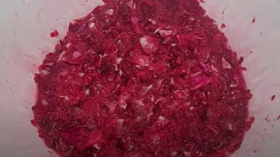 Okvětní lístky růží důkladně opláchněte a nasekejte je na menší kousky, které smíchejte s cukrem a citronovou solí.