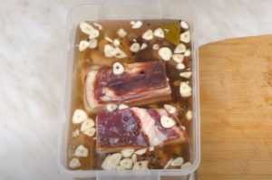 Česnek nakrájejte na tenké plátky. Maso nakrájejte na kusy asi 15 cm dlouhé a 5 cm široké. Půlku česneku dejte na dno nádoby, ve které se bude slanina nakládat. Přidejte maso a zasypejte ho zbytkem česneku. Pak ho zalijte lákem, aby bylo vše ponořené. Dejte na nádobu menší poklici a závaží, aby maso drželo ponořené.