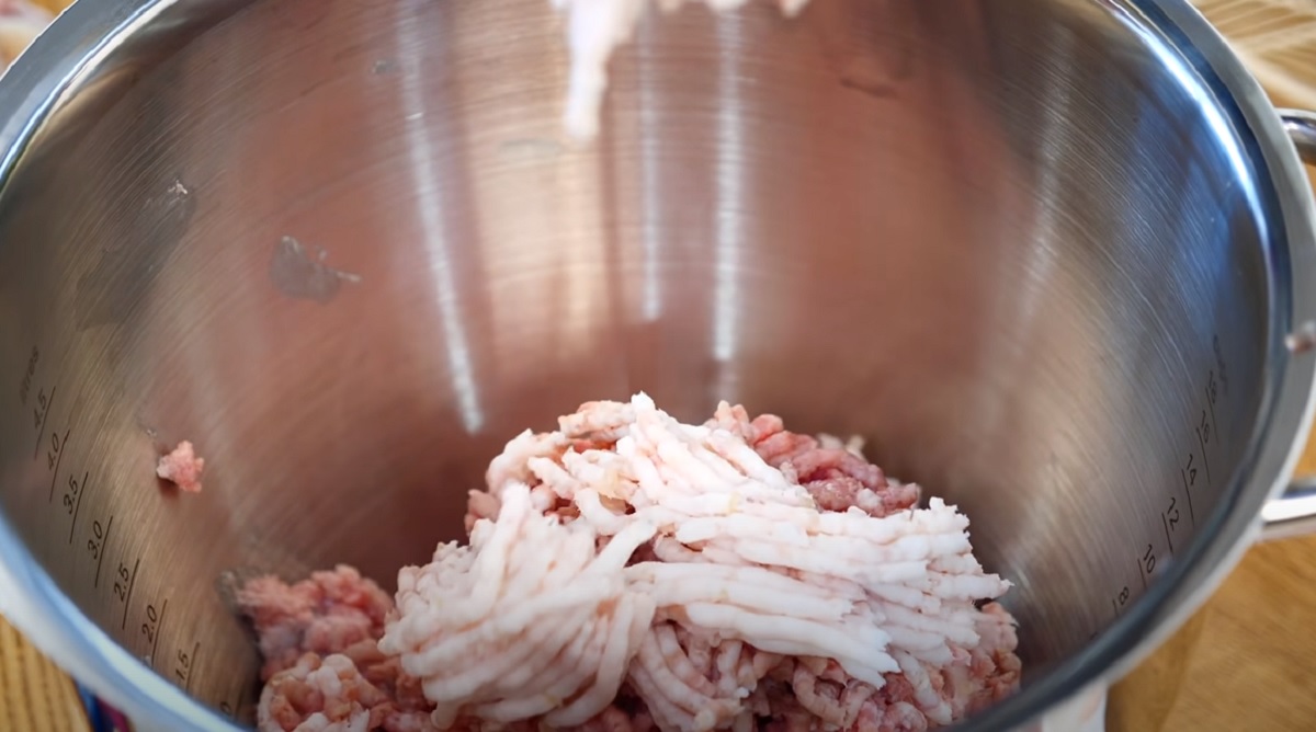 Z výše uvedených surovin získáte 7 sklenic po 700 ml slaninové paštiky. Chcete-li menší množství, upravte podle toho množství surovin. Slaninu a vepřové maso nakrájejte na kousky. Poté jej namelte mlýnkem na maso.