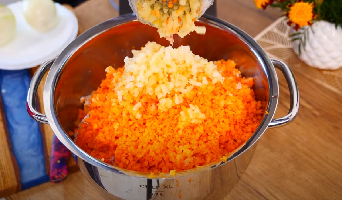 Mrkev také nakrájejte na kousky a protáhněte mlýnkem na maso, aby byla nádherně jemná. Použít můžete také jemné struhadlo. Nakrájejte cibuli na kousky a nastrouhejte na jemném struhadle.