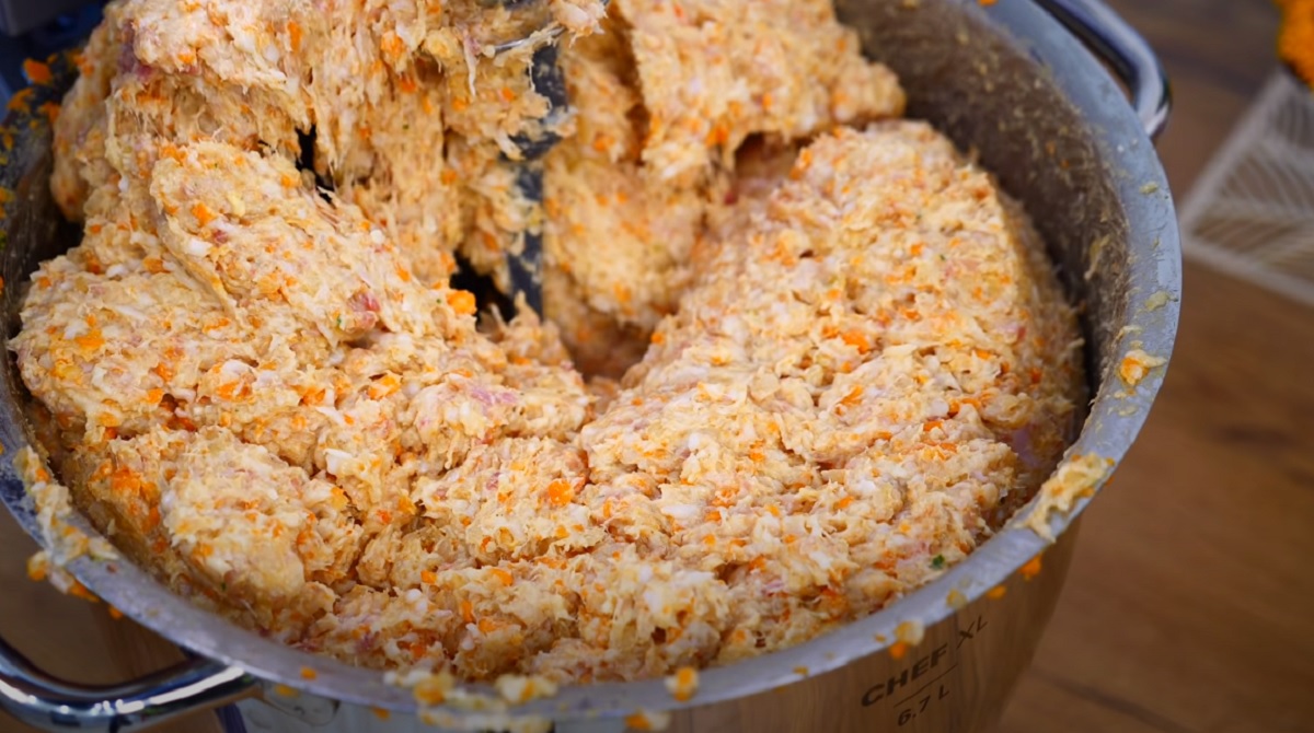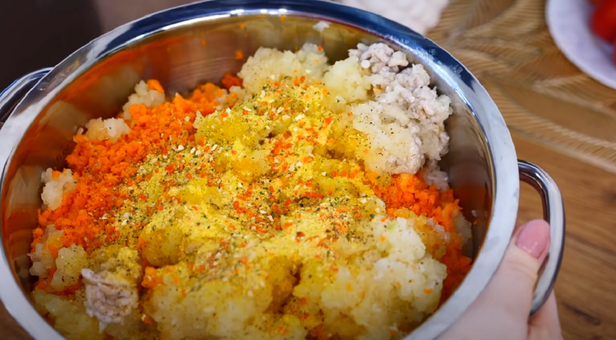 Všechny připravené suroviny vložte do velké a hluboké mísy. Podle chuti přidejte do směsi také sušenou zeleninu, sůl a pepř.