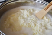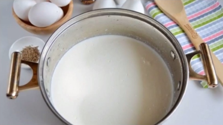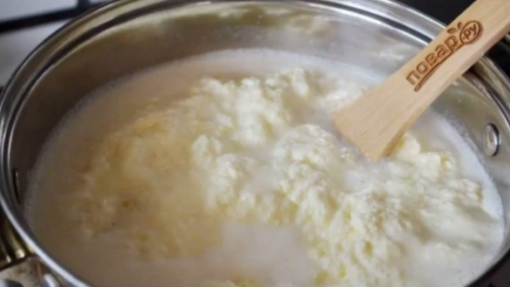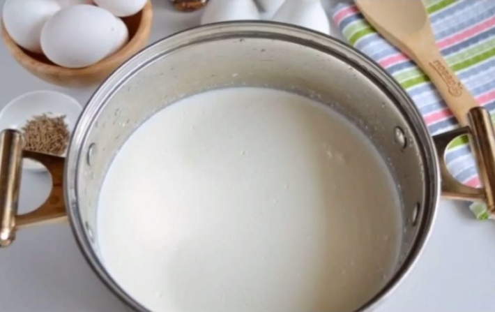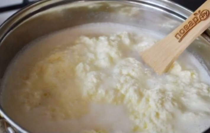 Poté si v misce vyšlehejte vajíčka se solí a až bude mléko s kefírem horké, vlijte je do hrnce. Následně počkejte, až se oddělí syrovátka. Vše zahřívejte pouze na mírném ohni. Nakonec tekutinu odstavte ze sporáku a nechte asi dvě minuty chladnout.